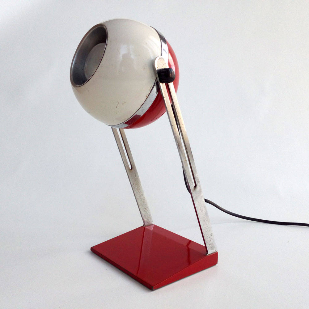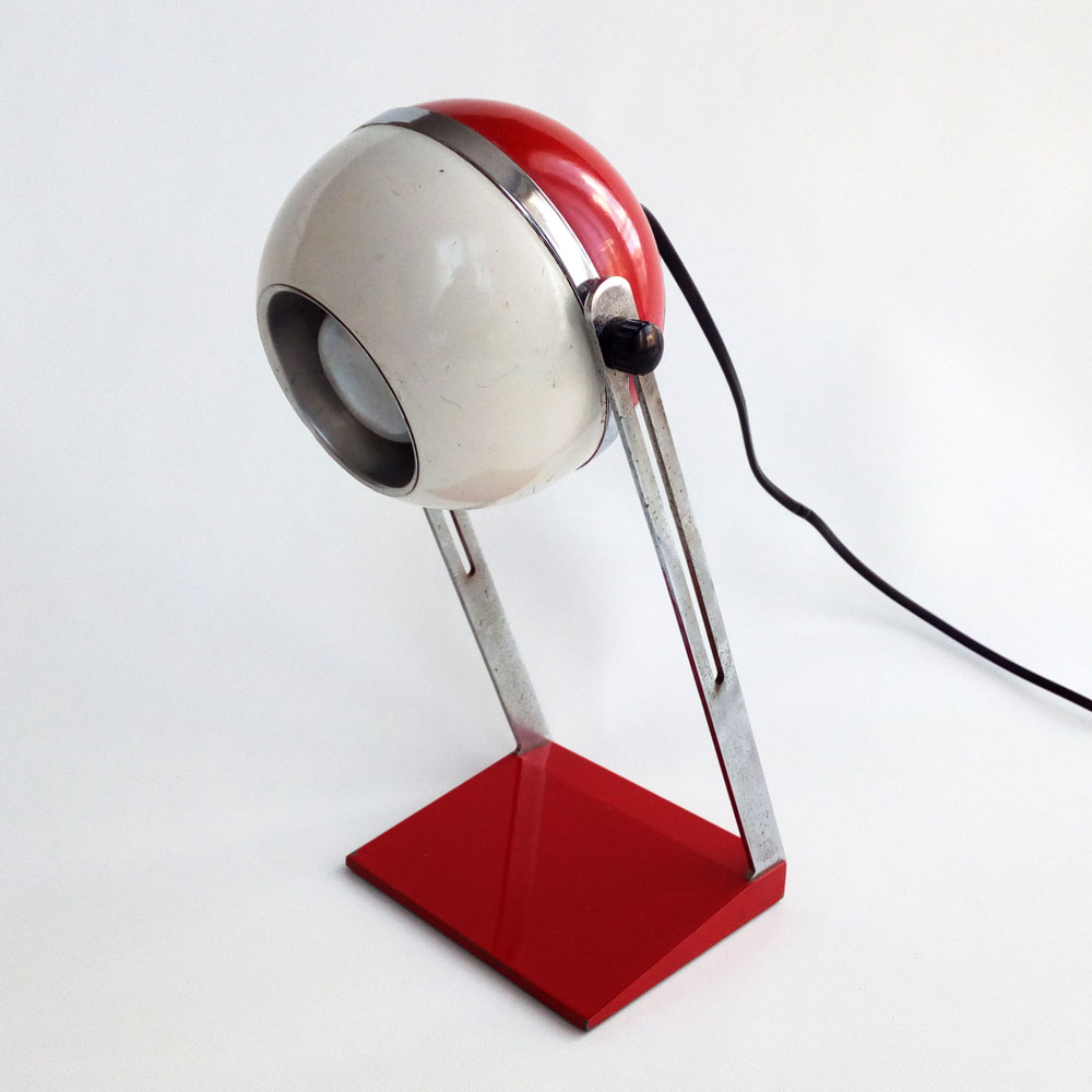 Petite lampe de chevet dont la forme particulière et sa couleur deux tons, font penser aux Pokeball.